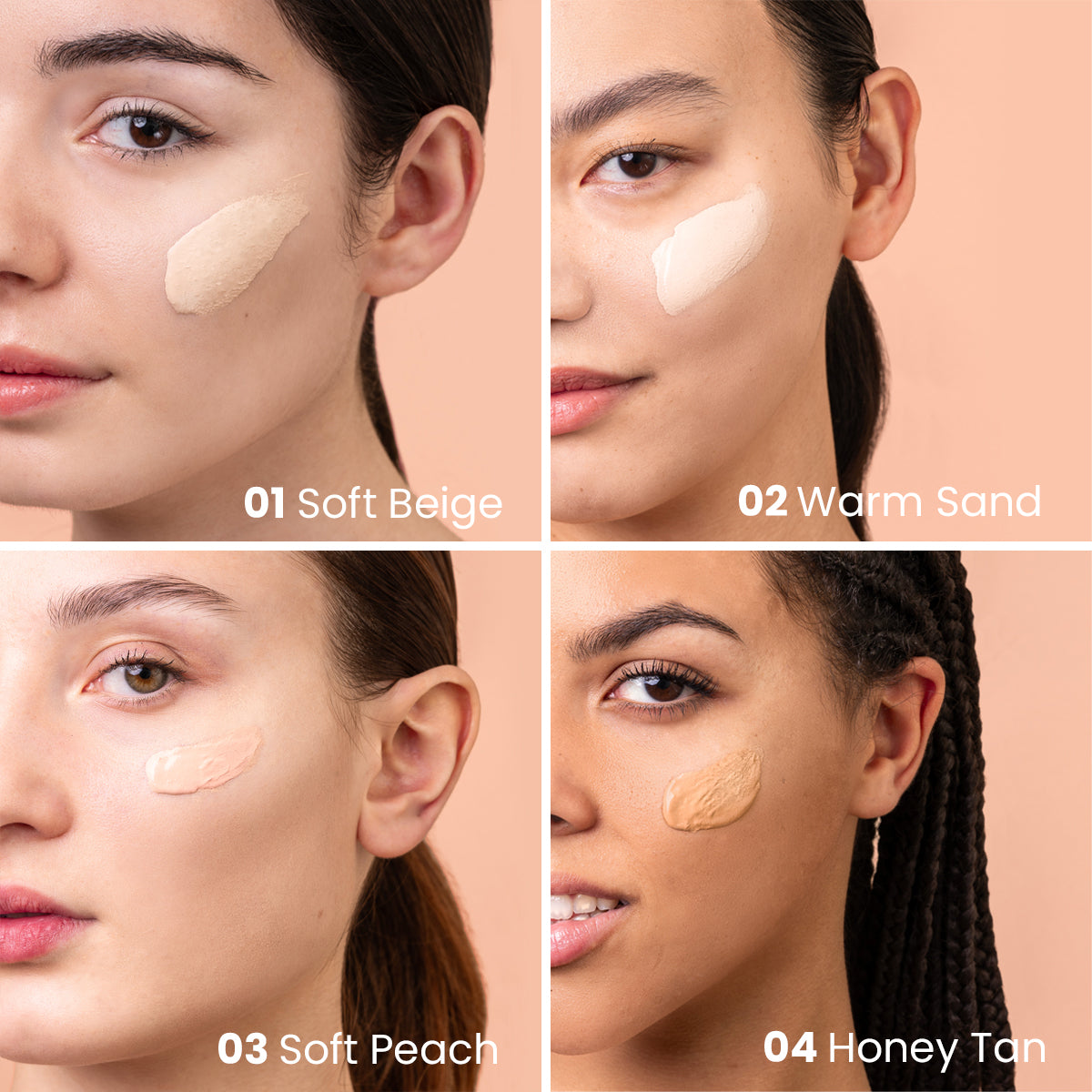 03 Soft Peach: la tonalità più versatile, si adatta a molteplici carnagioni. È particolarmente indicato per le pelli con sottotono rosato o neutro, conferendo freschezza e luminosità.
