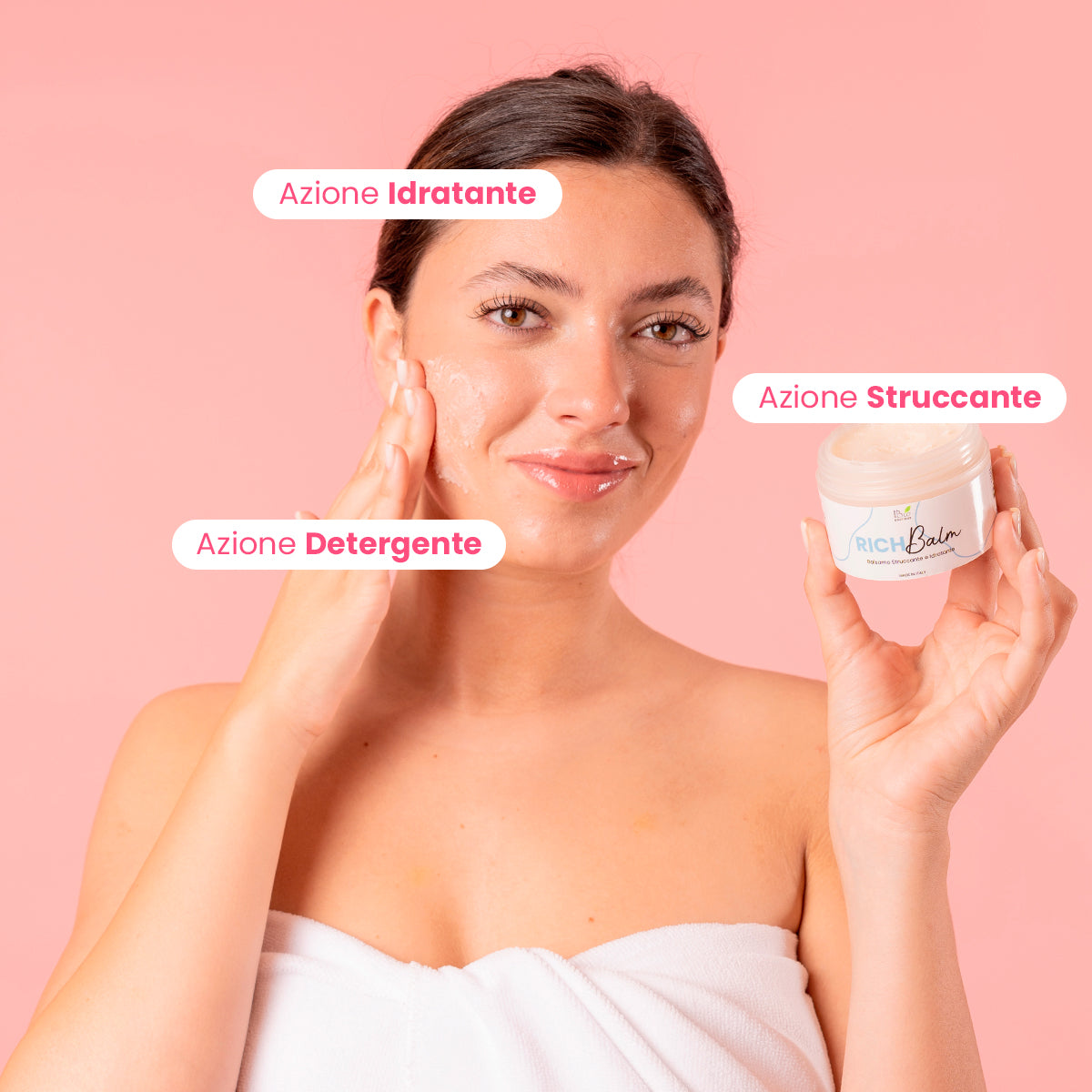 Rich Balm è un balsamo struccante naturale che rimuove completamente il trucco, anche quello waterproof, e deterge il viso profondamente, eliminando le impurità e le tracce di inquinamento.