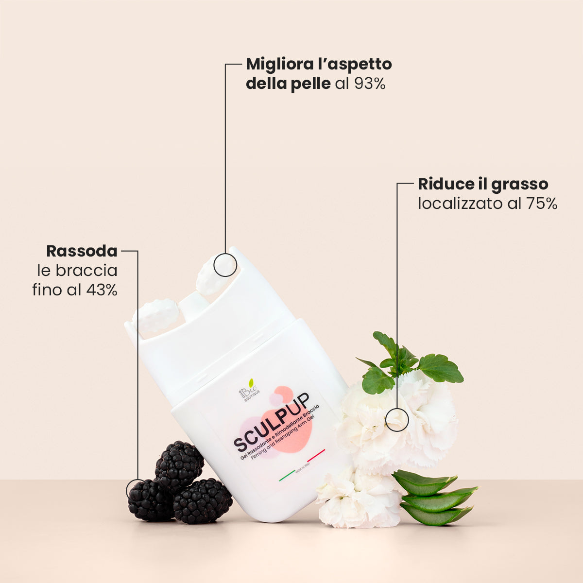 Azione Rivitalizzante ed Elasticizzante, l’attivo innovativo SculpUp, standardizzato in Polifenoli di More, aiuta a proteggere la pelle dallo stress ossidativo, migliorando la produzione di collagene e l’elasticità cutanea.